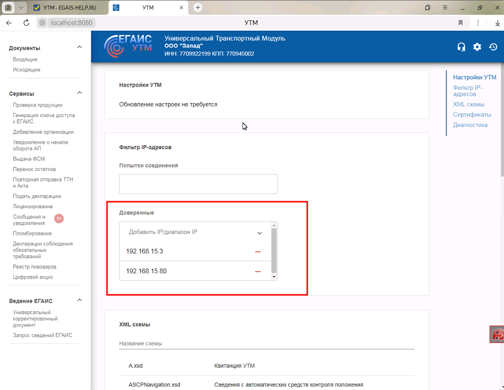 Далее на странице УТМ нажимаем на значёк шестерёнки (вверху справа) и вручную вбиваем доверенные ip адреса которые мы сохранили выполняя первый пунк инструкции.