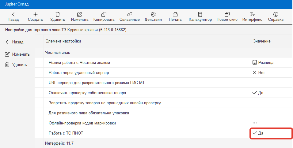 После того как режим работы с Честным знаком выбран, нужно внести настройки в раздел "Работа с ТС ПИОТ".