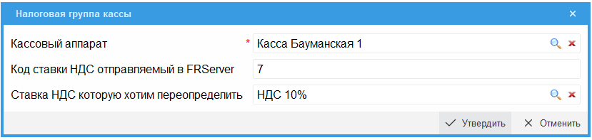 В настройках указываем Кассовый аппарат, Ставку НДС, которую планируем переопределить номером (некорректная ставка, смотрим в файлах фрсервера в значении строки tax), в поле Номер указываем код ставки НДС, которую будет отправляться на FRServer.