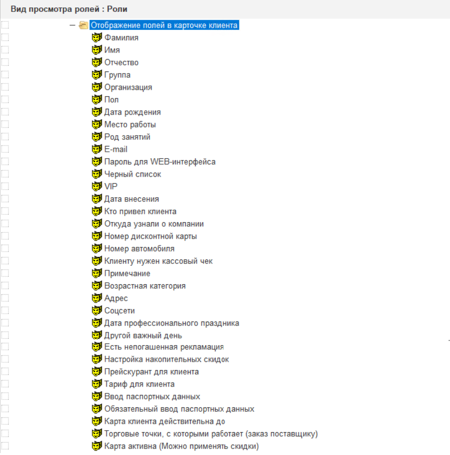 Карточка клиента зависит от настроенных прав пользователя, который работает в базе. Пример настраиваемых полей: