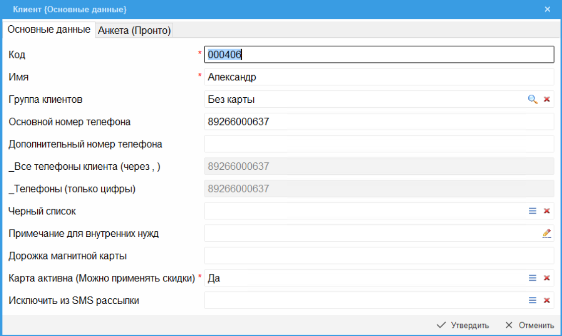 - Карта активна (Можно применять скидки) – статус карты клиента: активна/неактивна (влияет на применение скидок);