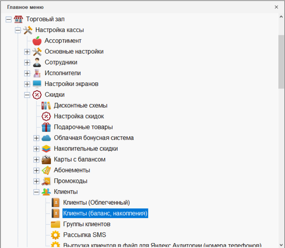- Клиенты (Баланс, накопления) - для просмотра текущего баланса по клиентам в локальной бонусной системе.