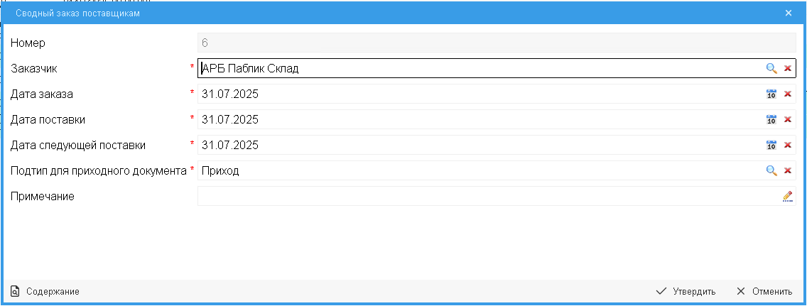 Менеджер открывает сводный заказ и видит позиции для заказа, сгруппированные по поставщикам.