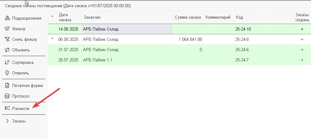 После внесения необходимых правок, необходимо подтвердить заказ. Для этого в списке заказов выделяем нужный документ и нажмите кнопку "Разнести"