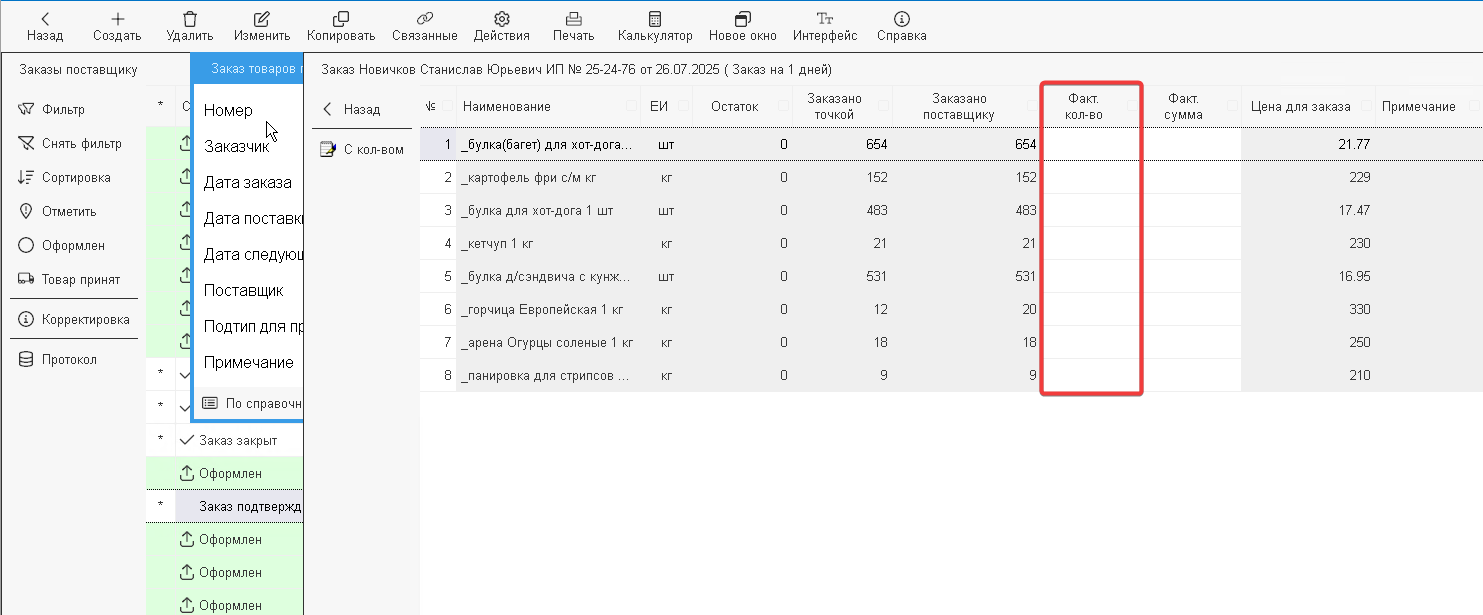 Но если при заполнении фактического количества и фактической суммы были расхождения выходящие за рамки допустимых, то заказ следует отправить на корректировку в отдел закупок.