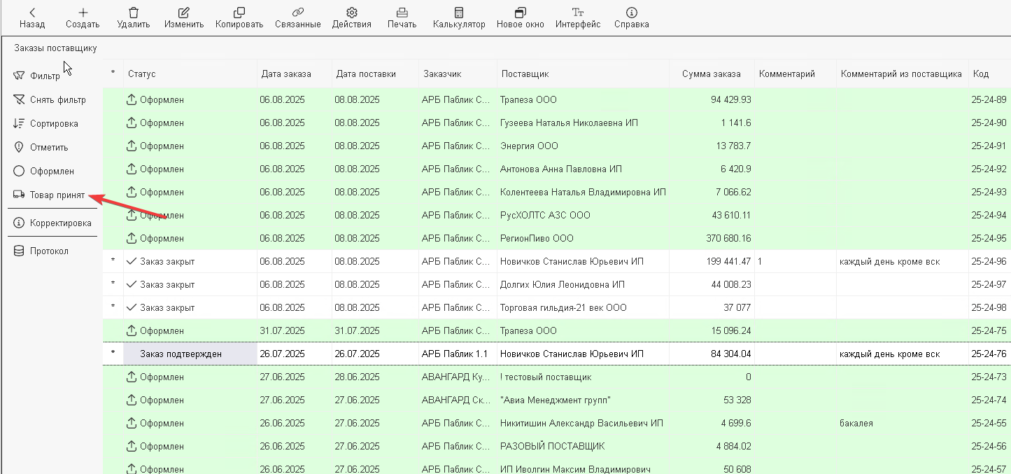 1. В списке заказов выделите нужный документ и нажмите кнопку "Товар принят";
