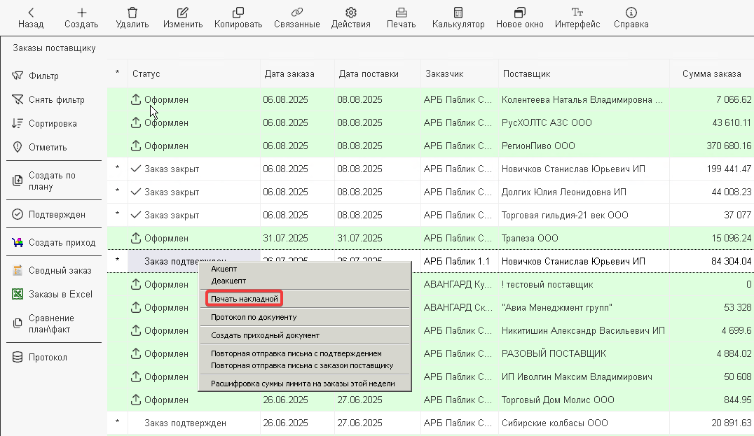 После подтверждается, если в карточке поставщика указан email, то заказ отправляется на почту. Также менеджер может сформировать документ с заказом в pdf-файл, правой клавишей кликнув на заказ и выбрав пункт Печать накладной.
