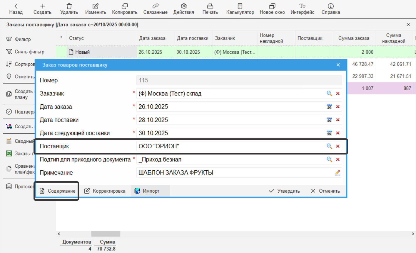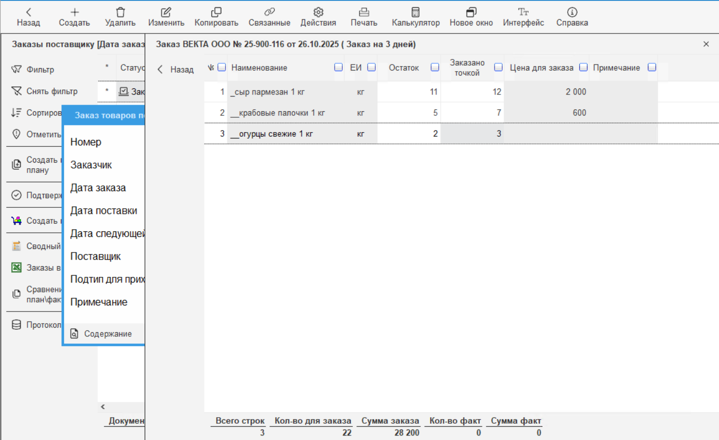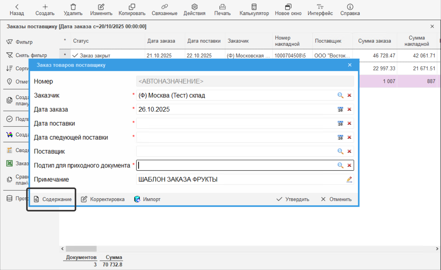 Полученный заказ поставщику будет включать только те ингредиенты которые необходимы для реализации плана производства за указный период. После создания документа его можно дополнить и отредактировать через кнопку Содержание.