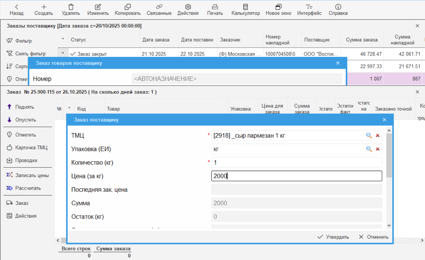 3. В форме строки заказа выберите товар (поле "ТМЦ"), в поле "Количество" впишите 0 и нажмите кнопку "Утвердить" (рис. 3);
