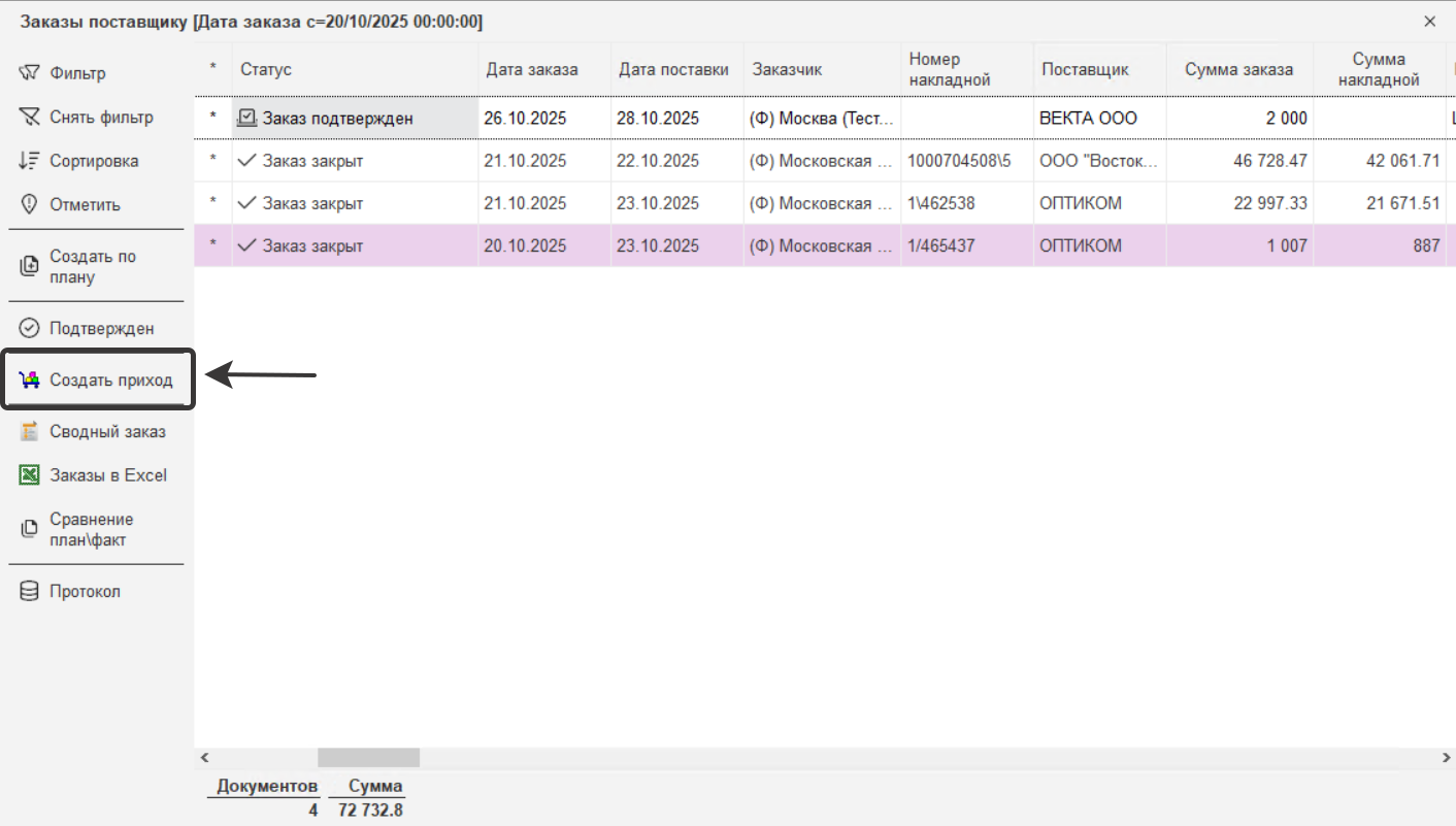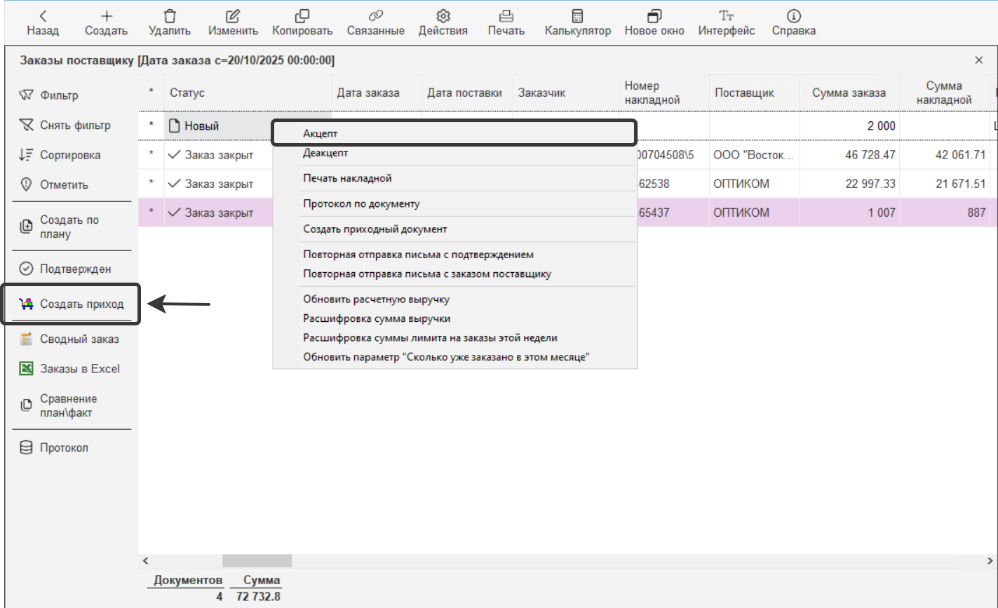 Что бы шаблон заказа передался на точки его необходимо подтвердить. Для этого в списке заказов выделите нужный документ, акцептуйте его и нажмите кнопку "Создать приход" (рис. 4).