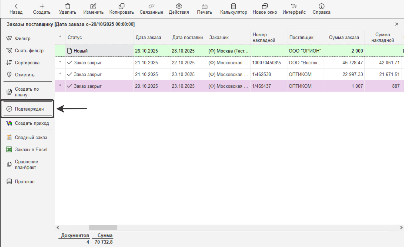 После назначения поставщика и внесения необходимых правок, необходимо подтвердить заказ. Для этого в списке заказов выделите нужный документ и нажмите кнопку "Подтвержден" (рис. 6).