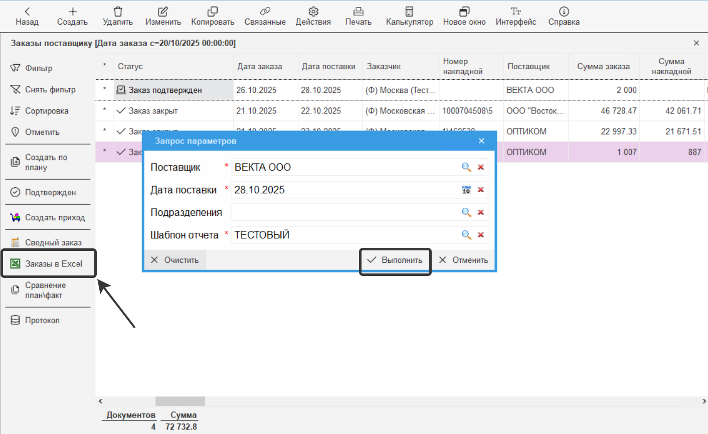 2. На левой панели инструментов нажмите кнопку "Заказы в Excel" (рис. 8);