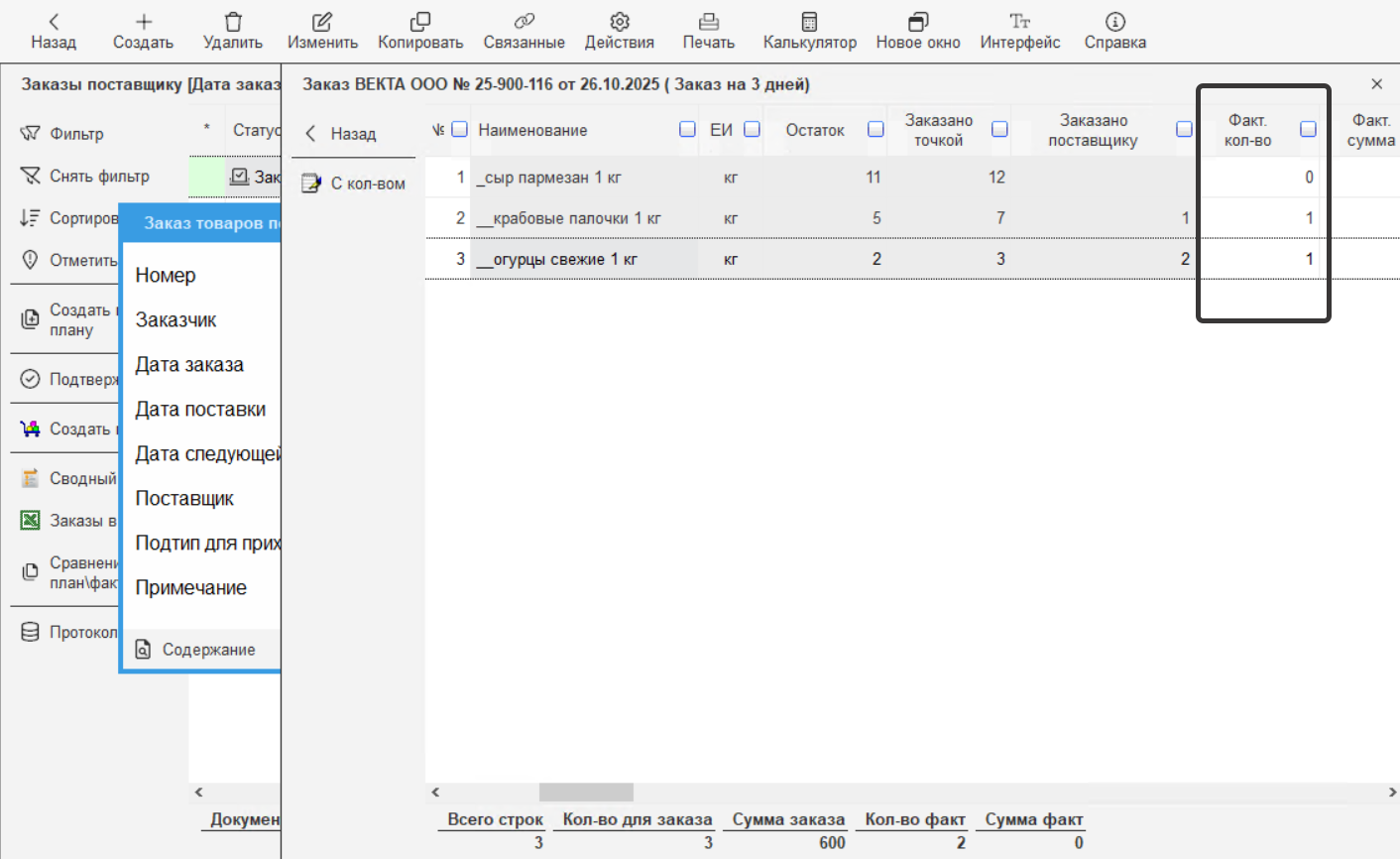 3. В открывшемся окне введите фактически полученное кол-во товара в колонку "Факт. кол-во" (рис. 13).